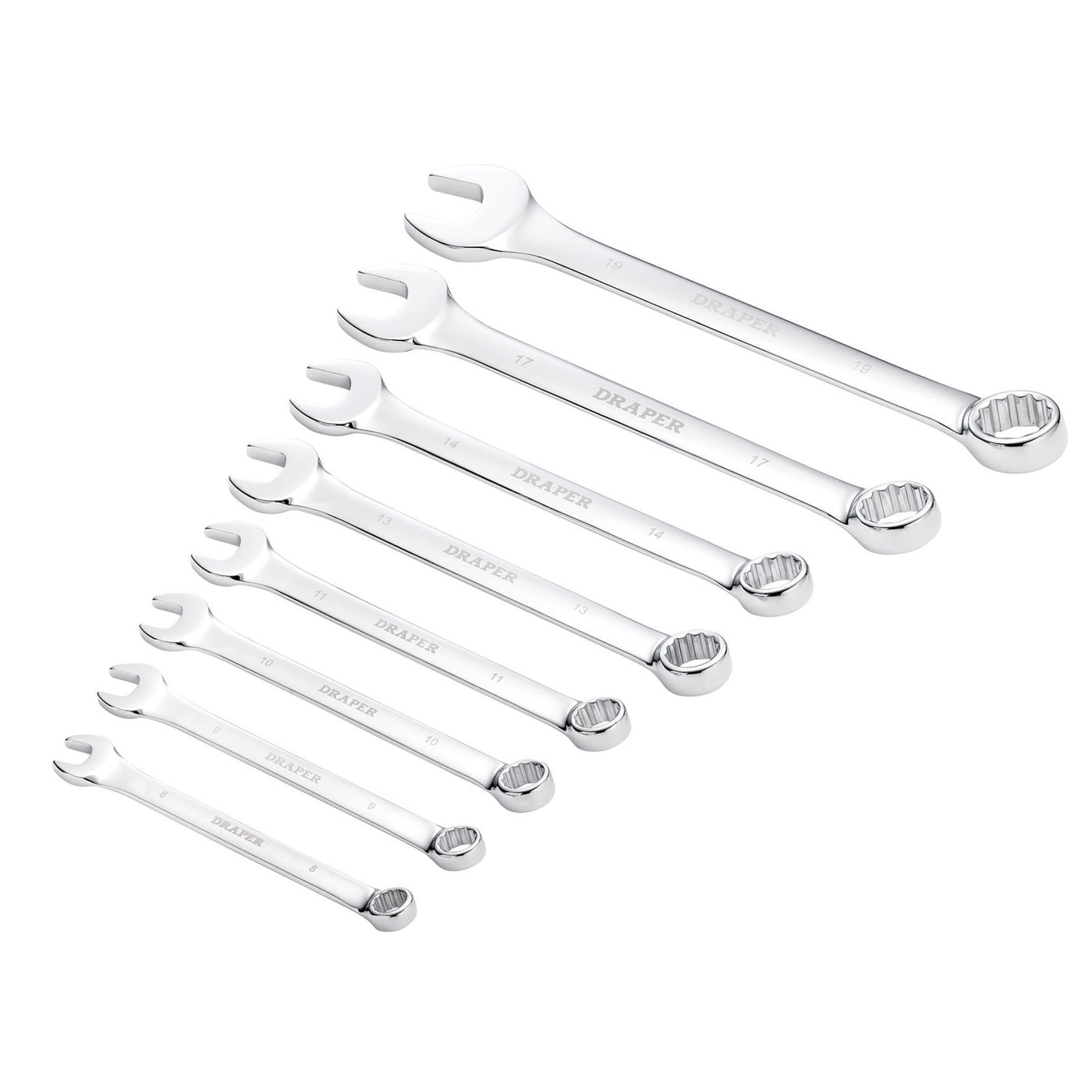 This combination spanner set is forged from chome vanadium steel, which is correctly hardened and tempered. Each is chrome plated and fully polished for corrosion protection. The 12-point Draper HI-TORQ® ring end is cranked at 15°. The jaw is offset at 15°. Supplied in a plastic storage rack. Sizes 8-19mm