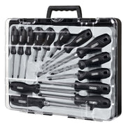 This hard grip screwdriver set offers a selection of popular sizes. Each screwdriver has a hardened chrome vanadium steel round blade with chrome plating for corrosion protection. The larger sizes have a hex bolster so they can be turned with a spanner for extra torque. The blade tips are magnetic to hold the screw in place, making it easier to deliver more accurate force and precise fastening and loosening. The tips also have a black phosphate coating for added durability. The comfortable moulded grip handles are made from high impact resistant plastic, which is easy to clean and resistant to oils and chemicals. The shaped handles help ensure the screwdrivers do not roll off flat surfaces. There is a hang hole integrated into the handles for convenient storage. Supplied inside a plastic storage case with transparent lid.