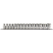 Expert Quality, manufactured from chrome vanadium steel hardened and tempered with a micro satin finish. Each socket has a knurled ring for extra grip. Supplied on a metal socket rail for secure storage.
