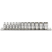 Expert Quality, 6 point socket manufactured from chrome vanadium steel, hardened and tempered with a micro satin finish. Each socket has a knurled ring for extra grip. Supplied on a metal socket rail for secure storage.