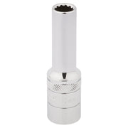 Expert Quality, 12 point deep socket manufactured from chrome vanadium steel that's hardened and tempered with a polished finish. Each socket has a knurled ring for extra grip.