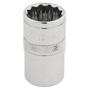 Expert Quality, 12 point socket manufactured from chrome vanadium steel that's hardened and tempered with a polished finish. Each socket has a knurled ring for extra grip.