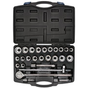 Socket set, manufactured from carbon steel that's hardened and tempered with a polished finish. Packed in plastic storage case.