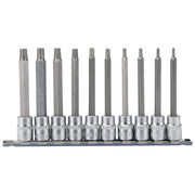 Expert Quality, 10 Draper TX-STAR® Plus socket bits, 100mm long. All socket manufactured from hardened and tempered chrome vanadium steel with sand blasted bits of S2 silicon steel. Each socket has a knurled ring for extra grip. Supplied on a steel socket retaining rail.