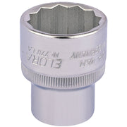 Professional Quality, socket manufactured from chrome vanadium steel hardened, tempered and chrome plated for corrosion protection. Chamfered end allows positive nut location and entry. Hole for driving accessory spring-loaded ball.