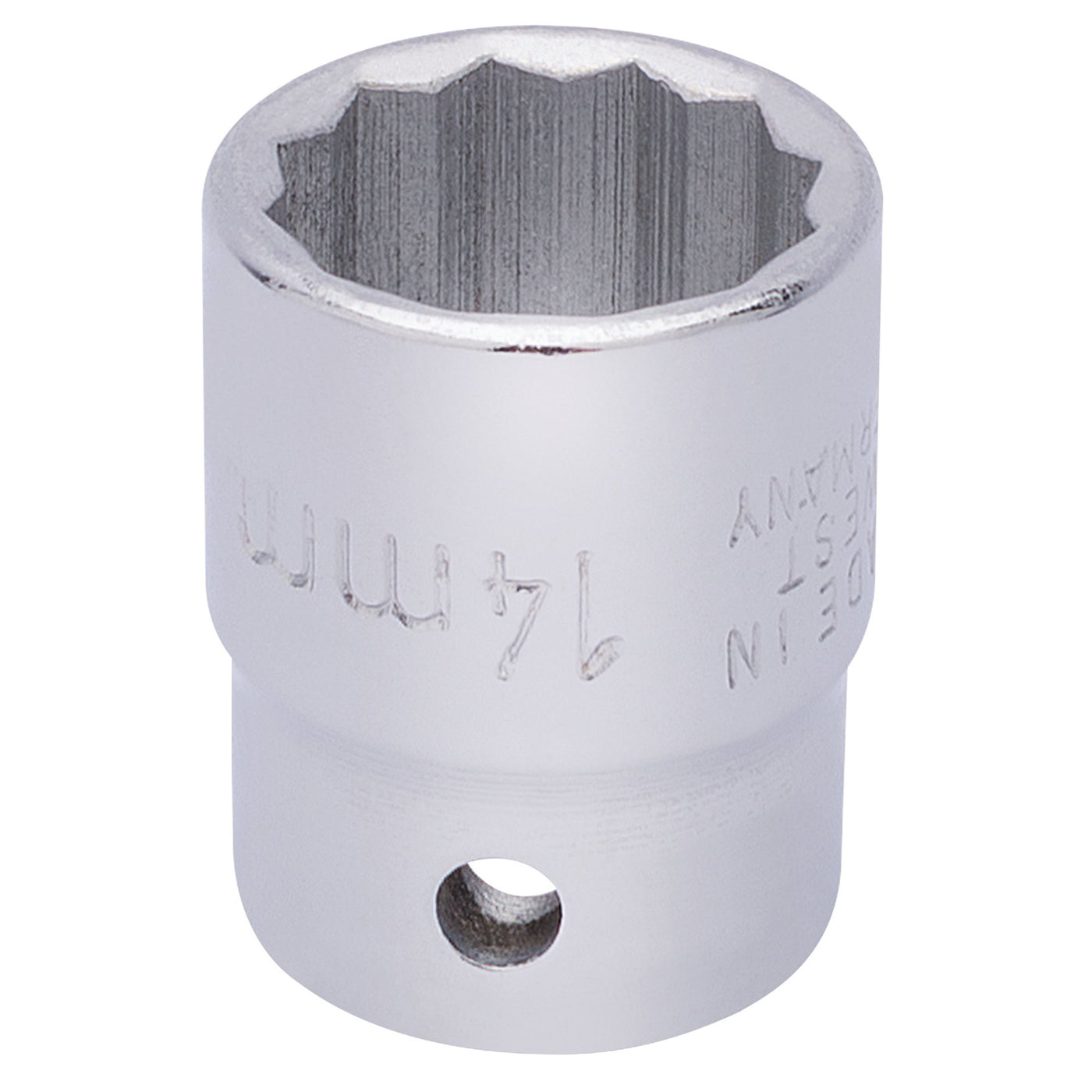 Professional Quality, socket manufactured from chrome vanadium steel hardened, tempered and chrome plated for corrosion protection. Chamfered end allows positive nut location and entry. Hole for driving accessory spring-loaded ball bearing.