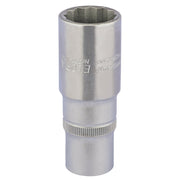 Professional Quality, socket manufactured from chrome vanadium steel hardened, tempered and chrome plated for corrosion protection. Chamfered end allows positive nut location and entry. Hole for driving accessory spring-loaded ball. Overall length 80mm.