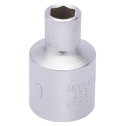 Professional Quality, socket manufactured from chrome vanadium steel hardened, tempered and chrome plated for corrosion protection. Chamfered end allows positive nut location and entry. Hole for driving accessory spring-loaded ball bearing.