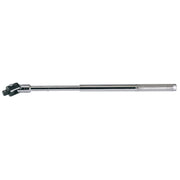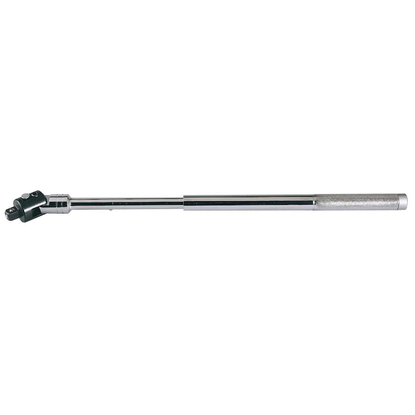 Expert Quality, head and shaft manufactured from chrome molybdenum steel hardened, tempered, chrome plated and polished for corrosion protection. Hinged joint head and knurled grip. Extending handle locks in any position between 400mm (Minimum) and 600mm (maximum) and is carbon steel hardened, tempered and chrome plated. Spring - loaded ball bearing for secure socket holding. Packed in polythene bag.
