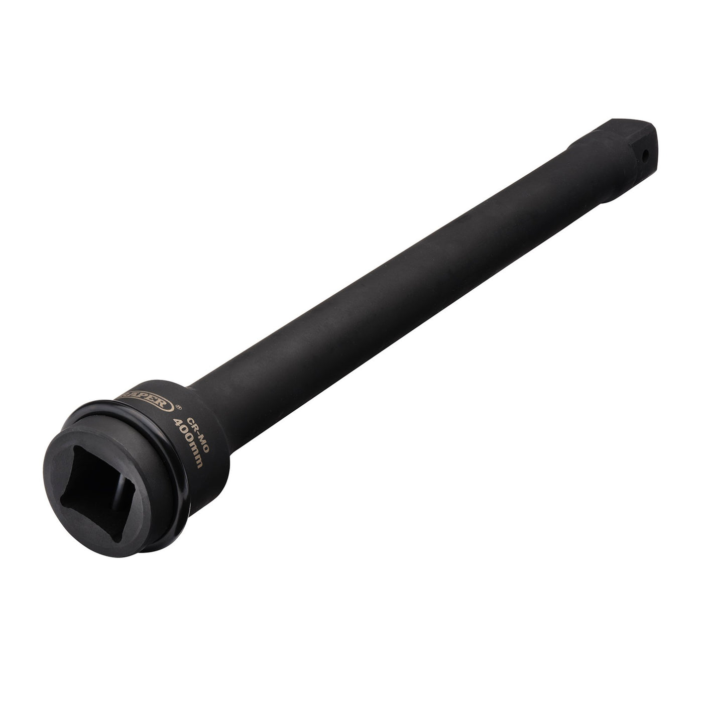 This impact extension bar is forged from hardened chrome molybdenum steel. Black phosphate finish for corrosion protection. For use with electric or pneumatic impact wrenches with a 1" drive. Supplied with ring and pin.