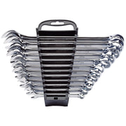 Expert Quality, with Draper Expert HI-TORQ® ring end cranked at 15°. Open end set at 15°. Forged from hardened and tempered chrome vanadium steel. Supplied on wall mountable plastic storage rack.