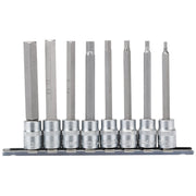 Expert Quality, 8 socket fitted with hexagonal bits. All socket manufactured from hardened and tempered chrome vanadium steel with sand blasted bits of S2 silicon steel. Each socket has a knurled ring for extra grip. Supplied on a steel socket retaining rail.