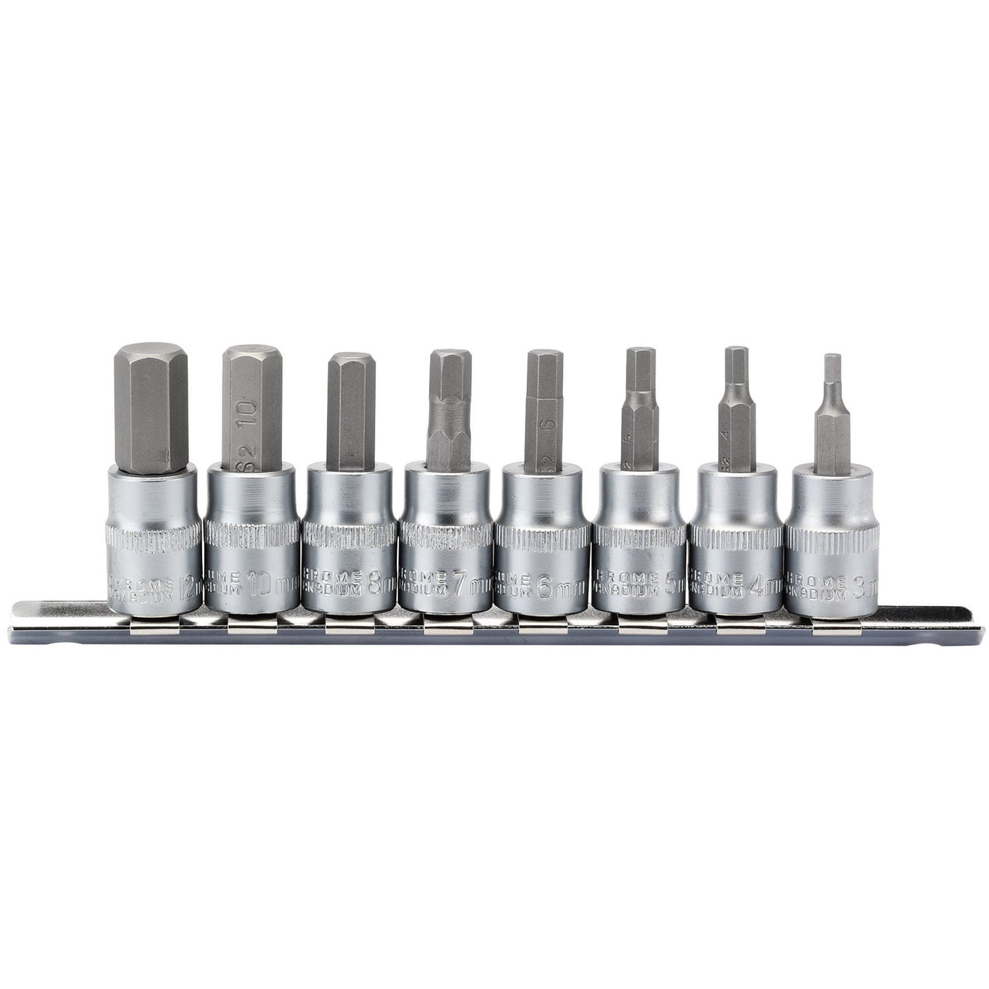 Expert Quality, 8 socket fitted with hexagonal bits. All socket manufactured from hardened and tempered chrome vanadium steel with sand blasted bits of S2 silicon steel. Each socket has a knurled ring for extra grip. Supplied on a steel socket retaining rail.