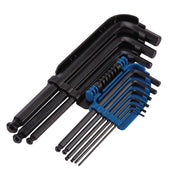 Hexagon keys with ball end on the long arm and conventional ends on short arm. The ball type hexagon tip allows the hexagon key to be used up to 30° angle from the screwhead recess. Manufactured from chrome vanadium steel that's hardened and tempered then applied with a chemically blackened finish. Supplied in fold-out easy release holder which can be wall-mounted.