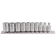6 point socket manufactured from chrome vanadium steel, hardened and tempered with a satin finish. Each socket has a knurled ring for extra grip. Supplied on a metal socket rail for secure storage.