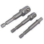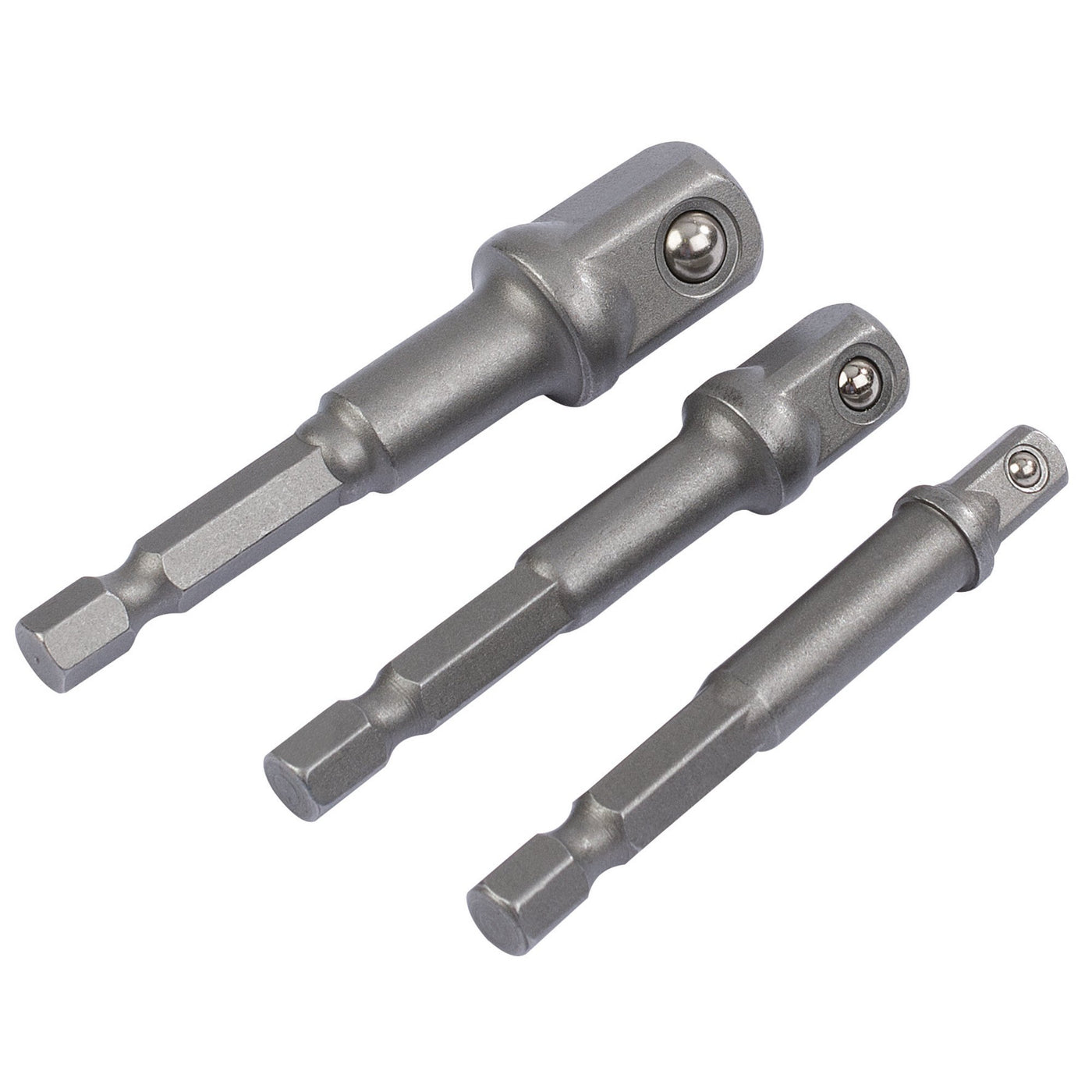 Designed for use in conjunction with any 1/4" hexagon drive unit, i.e. hand, electric or air screwdrivers, to drive 1/4", 3/8" and 1/2" square drive sockets. Comprises 1/4" hexagon x 1/4" square, 1/4" hexagon x 3/8" square and a 1/4" hex x 1/2" square adaptors. Manufactured from chrome vanadium steel hardened, tempered and chrome plated. Each square driver end incorporates a spring-loaded retaining ball for secure socket holding. Display packed.