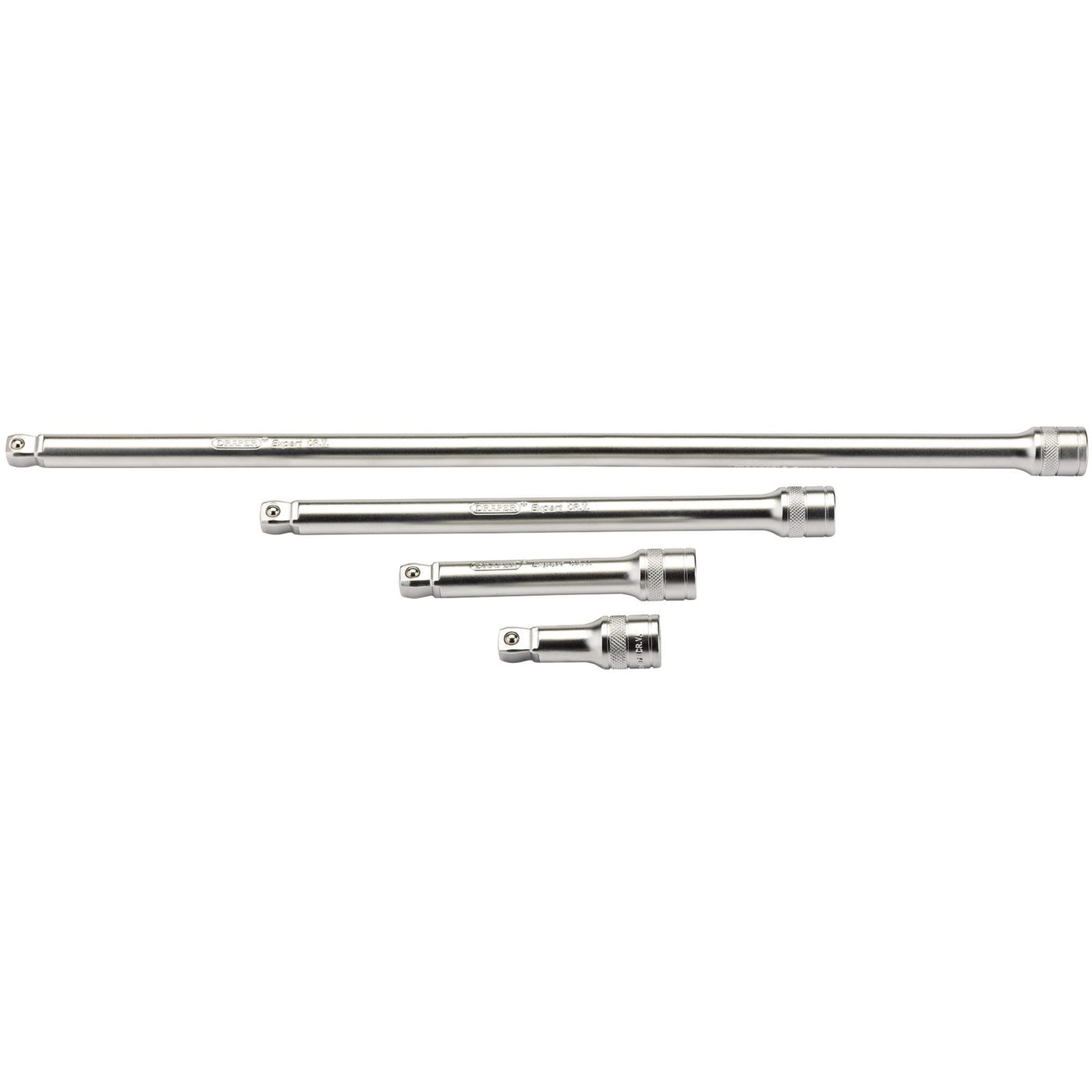 Expert Quality, with wobble end, manufactured from chrome vanadium steel hardened and tempered with a micro satin finish. Each ext. bar has a knurled ring for extra grip. Machined wobble end allows socket to be driven at up to 15° to the vertical. Attached with a spring - loaded ball bearing for secure socket holding.