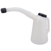 High density polyethylene. Resistant to diesel/petrol, oils and most acids. Flexible spout with carrying handle and screw top lid. Metric and US imperial graduations on jug body.