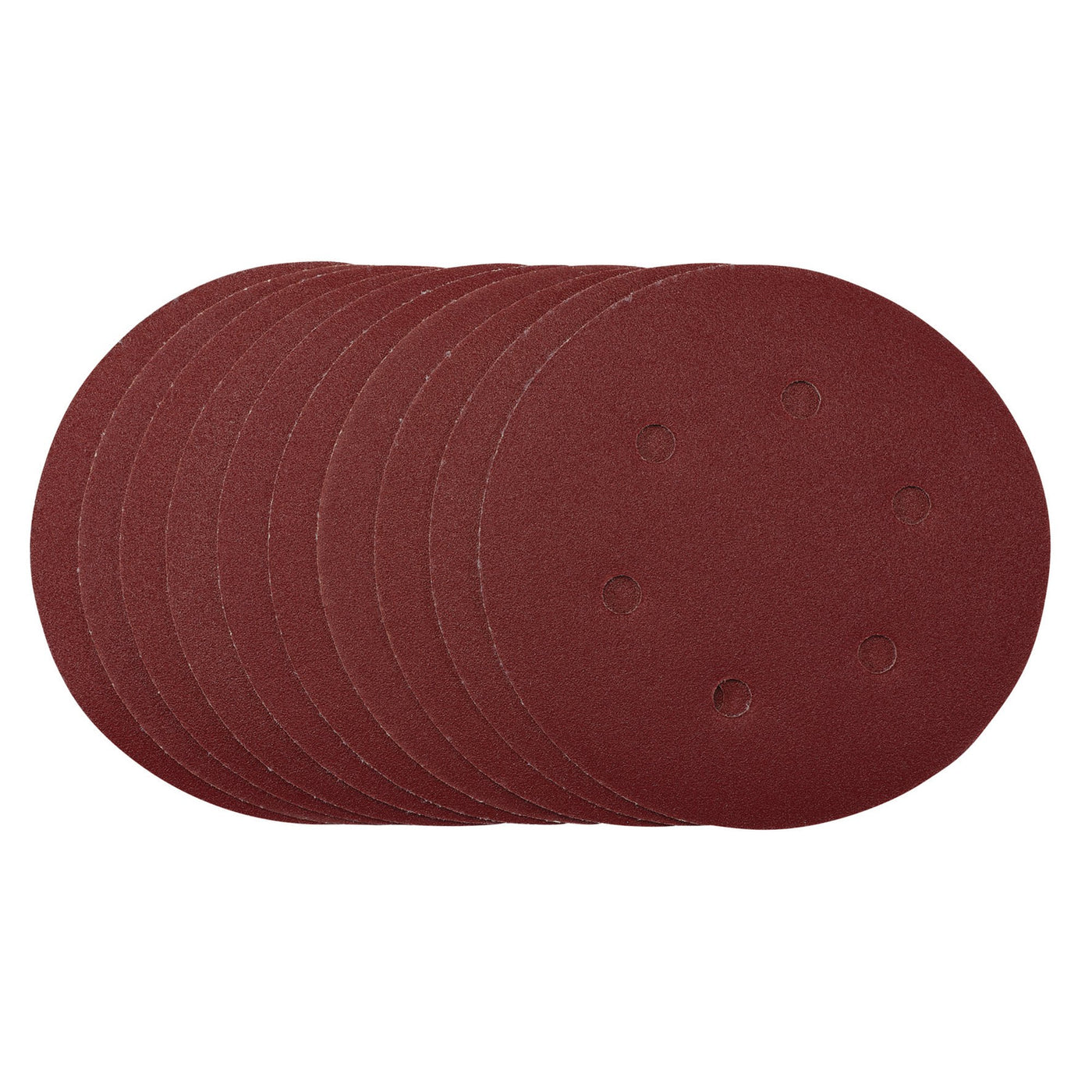 This pack of 10 premium quality aluminium oxide 150mm (120 grit) sanding discs are resin bonded to provide improved grain adhesion, anti-static qualities and long-lasting high performance. The heavy duty E-Weight backing paper makes the sanding disc more durable – able to withstand the toughest jobs. The hook and loop backing offers decent adhesion to facilitate the fast changing of sanding discs. The six pre-punched 8mm holes improve the dust extraction during sanding. Ideal for sanding and finishing wood, metal, aluminium alloy, painted surfaces, plastic and fillers. Compatible with all 150mm random orbital sanders with hook and loop backing pads.