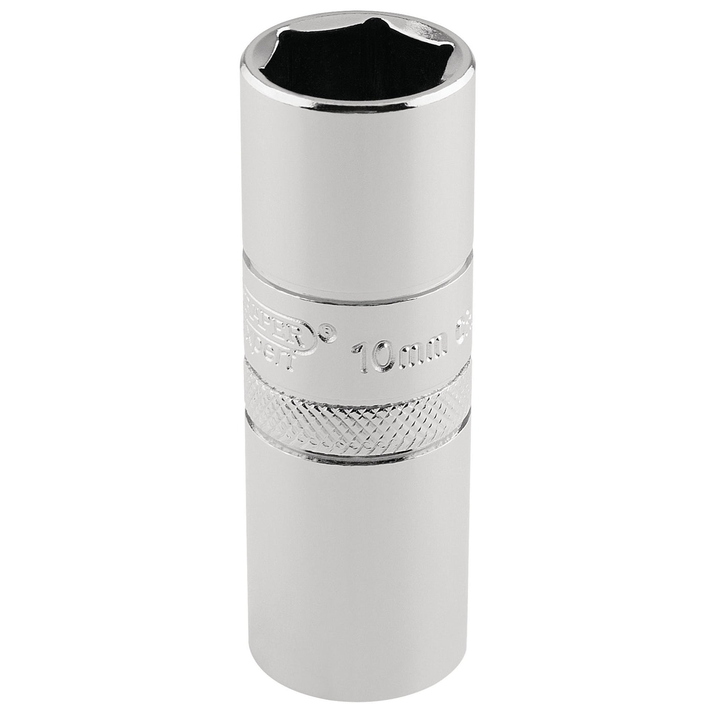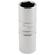 Expert Quality, 6 point deep socket with a rubber insert for plug protection and retention. Manufactured from chrome vanadium steel hardened and tempered with a polished finish. Socket length 65mm. Each socket has a knurled ring for extra grip.
